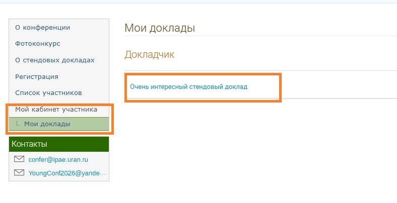 Обязательно укажите именно тот e‑mail, который вы указывали когда регистрировались в качестве участника конференции, чтобы система связала вас с вашим докладом.